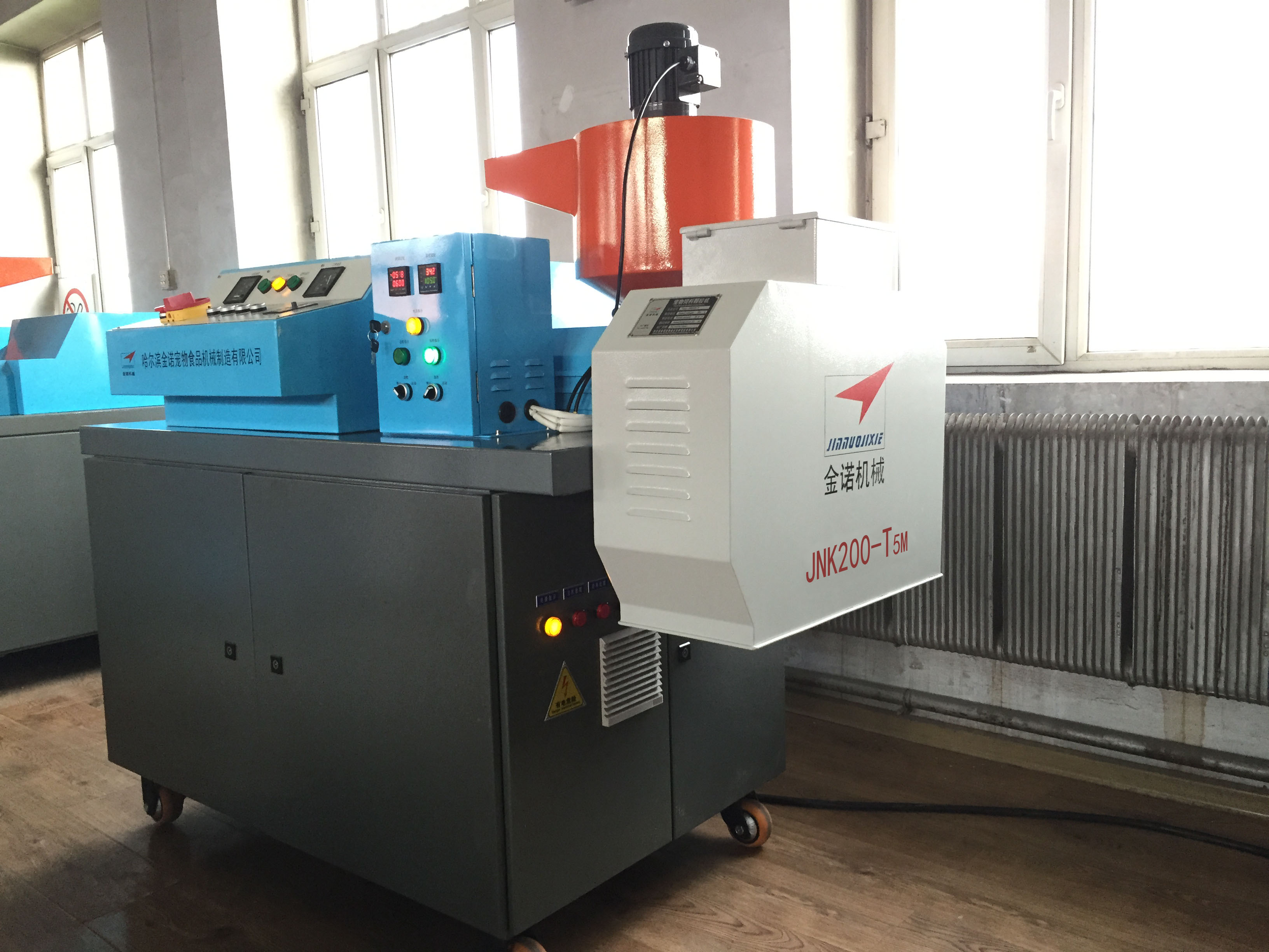 狗糧加工設(shè)備JNK200-T5M:1。JNK200-T5M型狗糧加工設(shè)備安裝方便、出廠(chǎng)已經(jīng)試機(jī),狗糧機(jī)切刀采用直角切刀技術(shù),調(diào)試簡(jiǎn)單;2。狗糧設(shè)備的主軸和切刀小軸均可隨時(shí)注入耐高溫潤(rùn)滑脂,延長(zhǎng)狗糧機(jī)的軸承使用壽命;3。JNK200-T5M狗糧設(shè)備每小時(shí)生產(chǎn)狗糧顆粒200公斤。